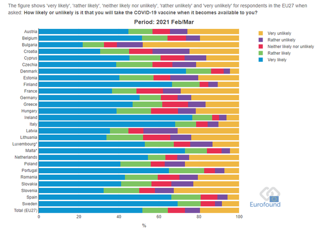 Τα αποτελέσματα της έρευνας δείχνουν επίσης ότι υπάρχει ισχυρή σχέση ανάμεσα στην διστακτική στάση απέναντι στο εμβόλιο και την χρήση των μέσων κοινωνικής δικτύωσης, ιδιαίτερα όταν τα μέσα κοινωνικής δικτύωσης αποτελούν την κύρια πηγή ενημέρωσης, σύμφωνα με το Eurofound.Οι Βούλγαροι ήταν την περίοδο πραγματοποίησης της έρευνας οι πλέον απρόθυμοι, με το 67% των ενηλίκων να δηλώνει ότι δεν είναι πιθανό ή δεν είναι καθόλου πιθανό να εμβολιασθεί, ενώ στην Ιρλανδία, μόνο των 10% δήλωνε ότι δεν θα κάνει εμβόλιο.
