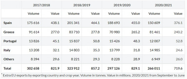 Κατά την περίοδο συγκομιδής 2019/2020, οι εξαγωγές επιτραπέζιων ελιών εκτός ΕΕ έφτασαν τους 297.126 τόνους, με εκτιμώμενη αξία 829,1 εκατομμύρια ευρώ (-8,3% και -3,3%, αντίστοιχα, σε σύγκριση με την προηγούμενη καλλιεργητική χρονιά).