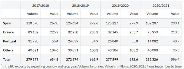 Από την άλλη πλευρά, οι ενδοκοινοτικές εξαγωγές ανήλθαν σε 277.599 τόνους, με εκτιμώμενη αξία 692,6 εκατ. ευρώ ( +1,8% και +4,5%, αντίστοιχα, σε σύγκριση με την προηγούμενη καλλιεργητική περίοδο).