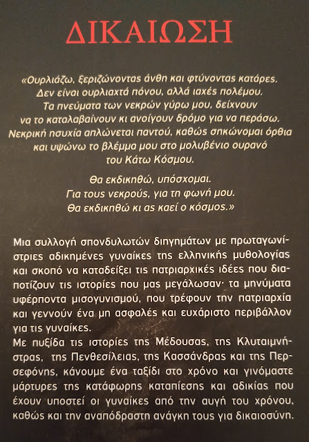 "Η ΔΙΚΑΙΩΣΗ" της Αντιγόνης Γαβρίδου (εκδόσεις ΜΑΤΙ) είναι μια συλλογή διηγημάτων με πρωταγωνίστριες αδικημένες γυναίκες της ελληνικής μυθολογίας, στις οποίες αντανακλάται ο μισογυνισμός και η πατριαρχία που από την αυγή του χρόνου, είχαν σαν αποτέλεσμα οι γυναίκες να έχουν υποστεί καταπίεση και αδικίες. Ένα βιβλίο με αναφορές στις ιστορίες της Μέδουσας, της Κλυταιμνήστρας, της Κασσάνδρας της Περσεφόνης, της Πενθεσίλειας στο σήμερα και την "επανάσταση" του metto.