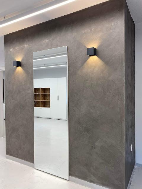 Τα τρία WC σε μοναδικά χρώματα με την τεχνική της πατητής τσιμεντοκονίας και αυτά και με την χρήση ειδικών κατασκευών γυψοσανίδας.