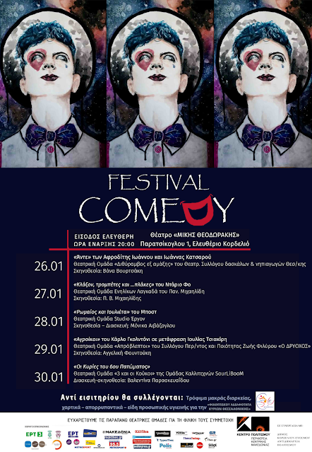Στο «Comedy Festival» φιλοξενούμε και φέτος 5 κωμωδίες από τις καλύτερες θεατρικές ομάδες της Περιφέρειας Κεντρικής Μακεδονίας. Στο Φετινό «Comedy Festival» θα φιλοξενηθούν τα εξής έργα:- Πέμπτη 26/01 – «Άντε» των Αφροδίτης Ιωάννου και Ιωάννας Κατσαρού από την Θεατρική Ομάδα «Διθύραμβος εξ αμάξης» του Θεατρικού Συλλόγου δασκάλων και νηπιαγωγών Νομού Θεσσαλονίκης.
