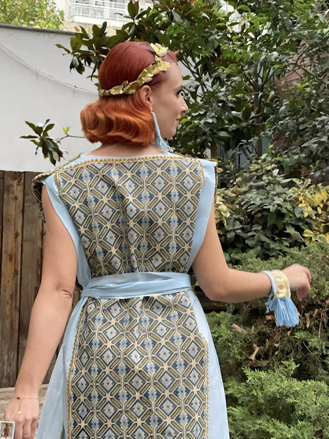 Με πρωταγωνιστή το γαλάζιο χρώμα, το χρώμα του ουρανού και της θάλασσας, το μπεζ, το χρώμα της άμμου αλλά και πινελιές χρυσού που εμπεριέχονται στο λαμπερό φως του ελληνικού ήλιου μας, δημιούργησε το κουστούμι με θέμα "Ελληνικό Φως".