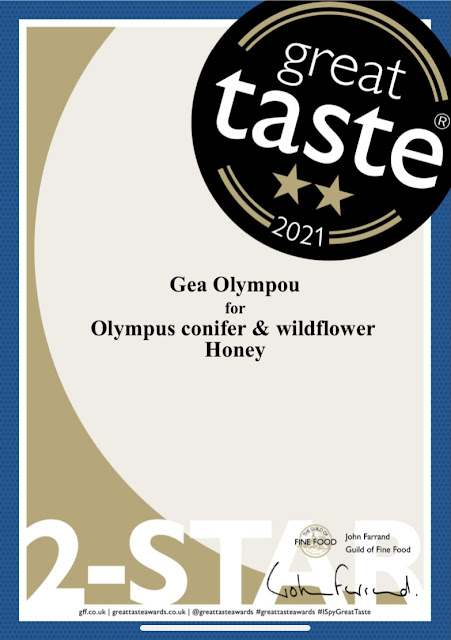 Η Γη Ολύμπου βραβεύτηκε στα Great Taste Awards 2021. Τα μέλια, «Αγριολούλουδα Ολύμπου & Κωνοφόρα» και «Βελανιδιά & Βότανα Ολύμπου», που παράγονται από τη Γη Ολύμπου,